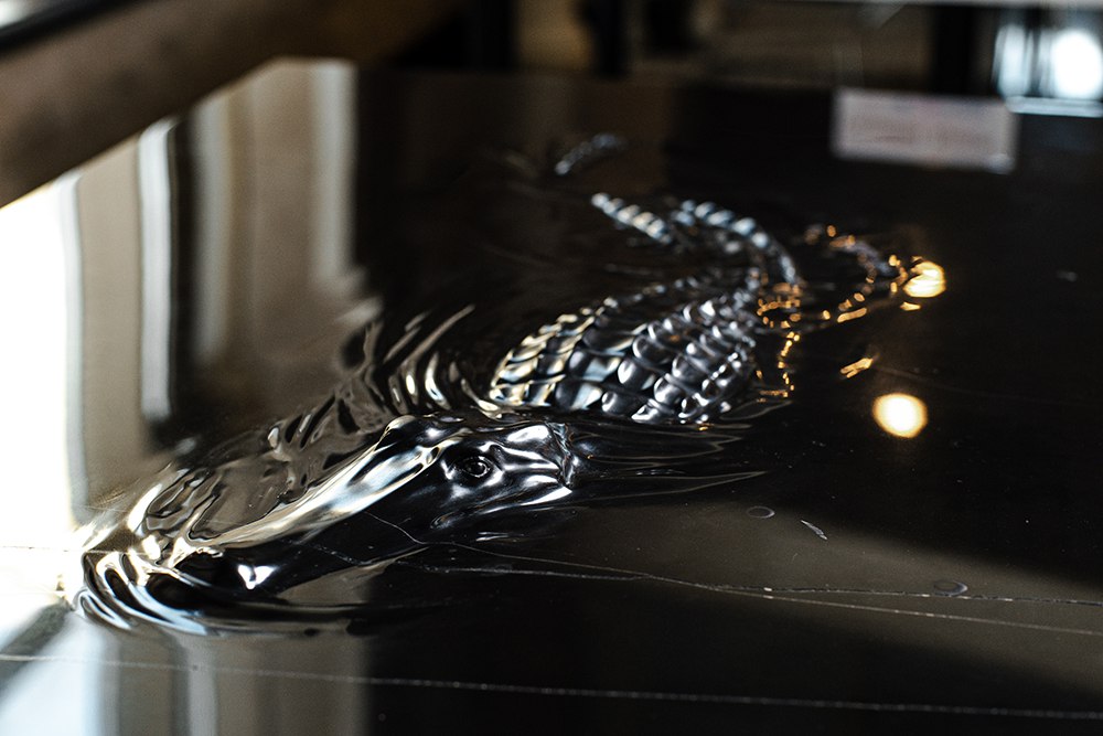 Что делает обычную черную столешницу произведением искусства? Барельефное изображение крокодила, которое превращает функциональный предмет мебели в настоящий арт-объект. Глянцевая поверхность усиливает эффект, создавая игру света и тени вокруг объемного изображения.