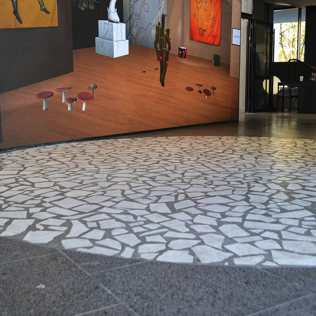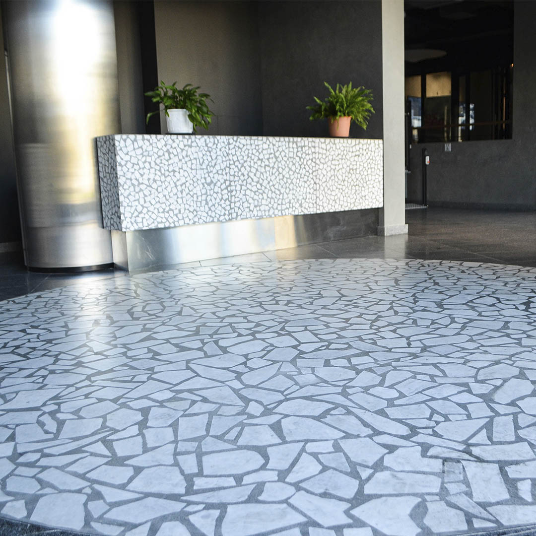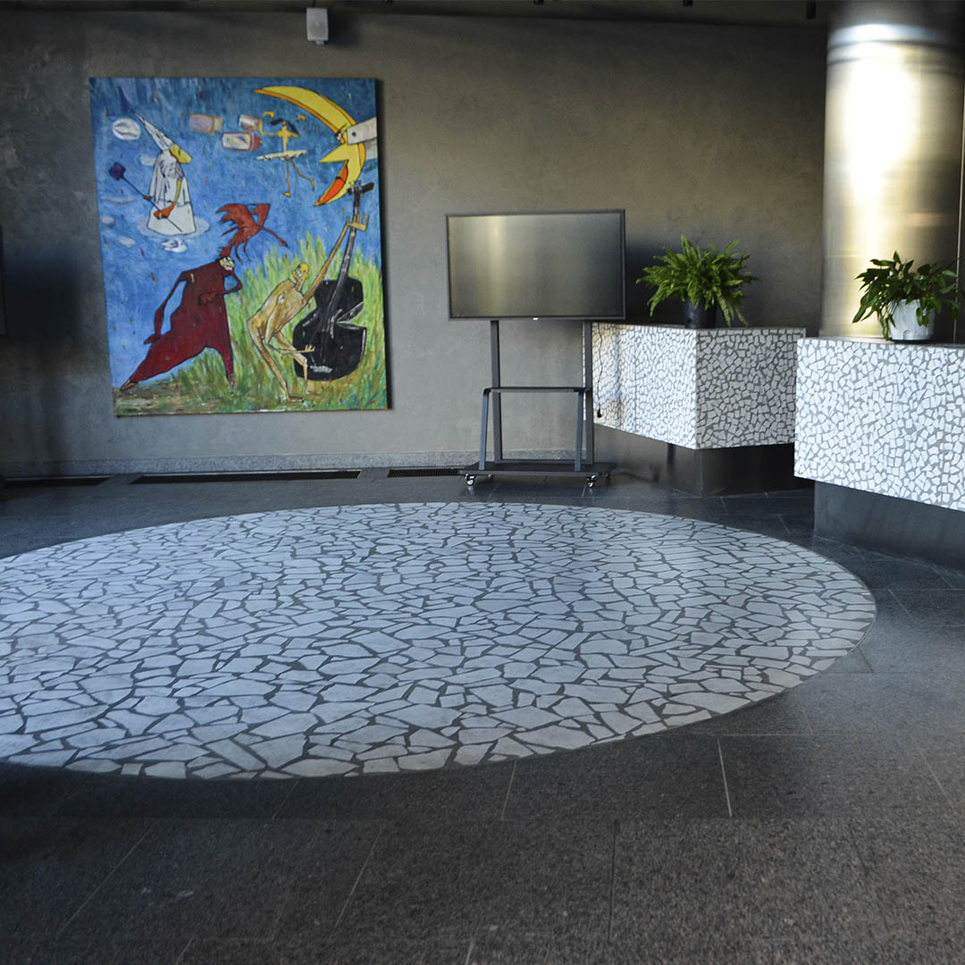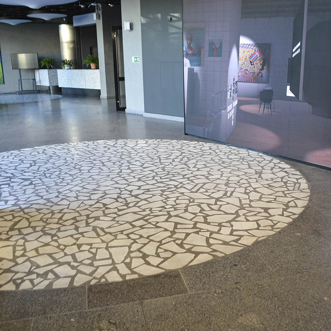 Апогеем дизайнерской мысли наших специалистов стал ресепшен в стиле терраццо - каждый фрагмент собран вручную и символизирует идею пространства Курехина, созданного из множества «кусочков» истории искусства.