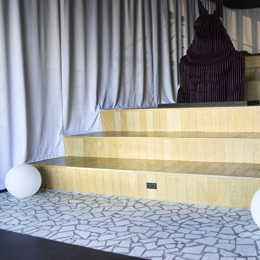 Наша команда также внесла свой вклад в этот уникальный проект. Мы вдохновились советским модернизмом и предложили нестандартное решение — полы терраццо из крупных элементов. Белые вкрапления мрамора Колелга, словно свет прожектора, превращают все пространство в большую сцену.